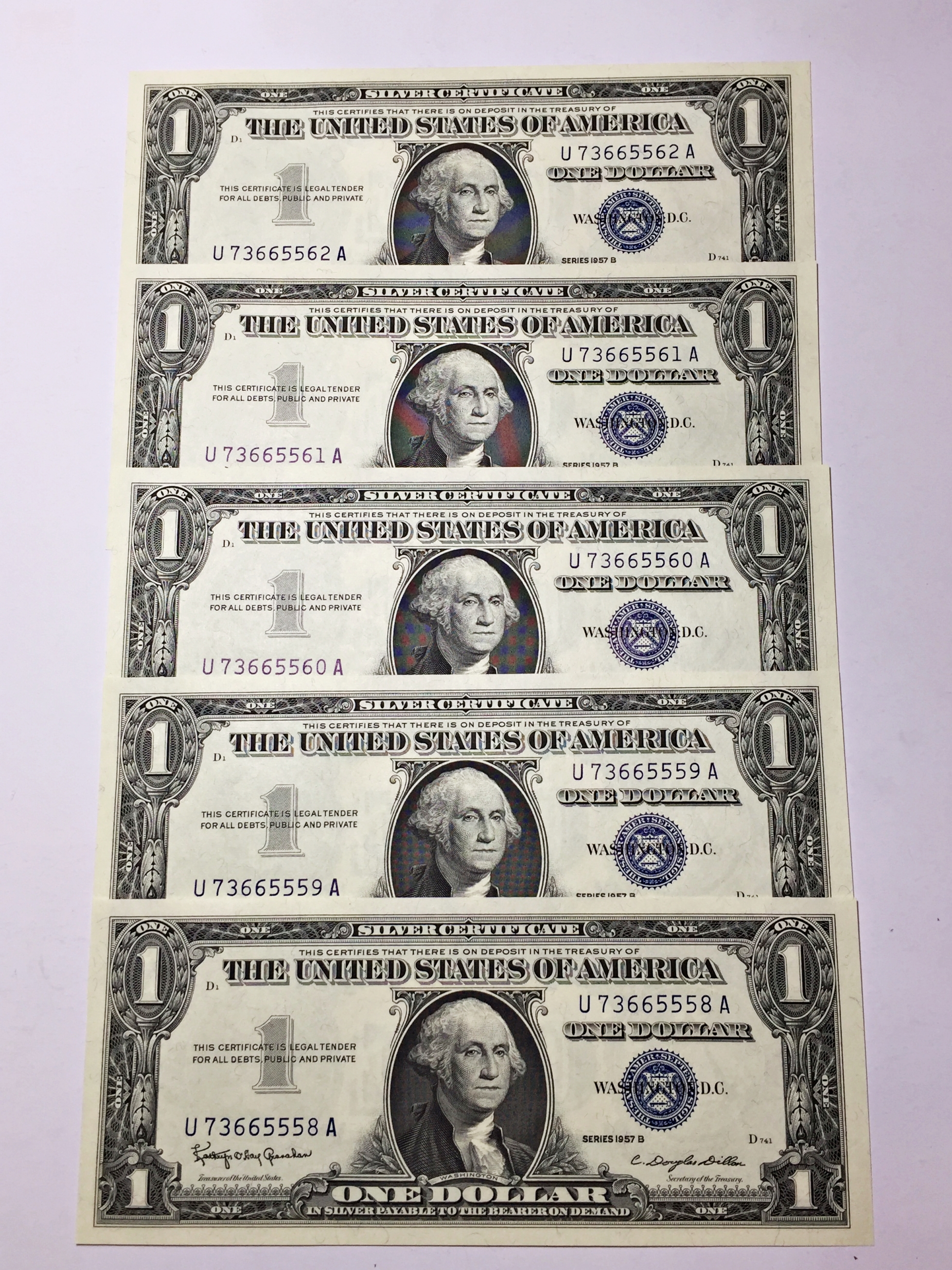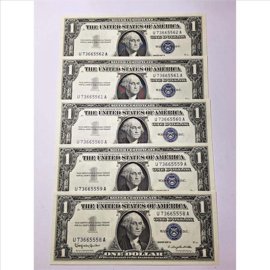 Lot of Five Series $1 1957B CONSECUTIVELY NUMBERED United States Silver Certificates*Crisp Uncirculated Notes!