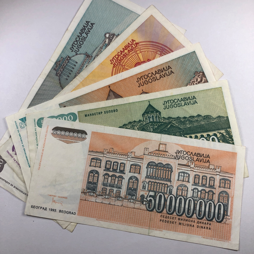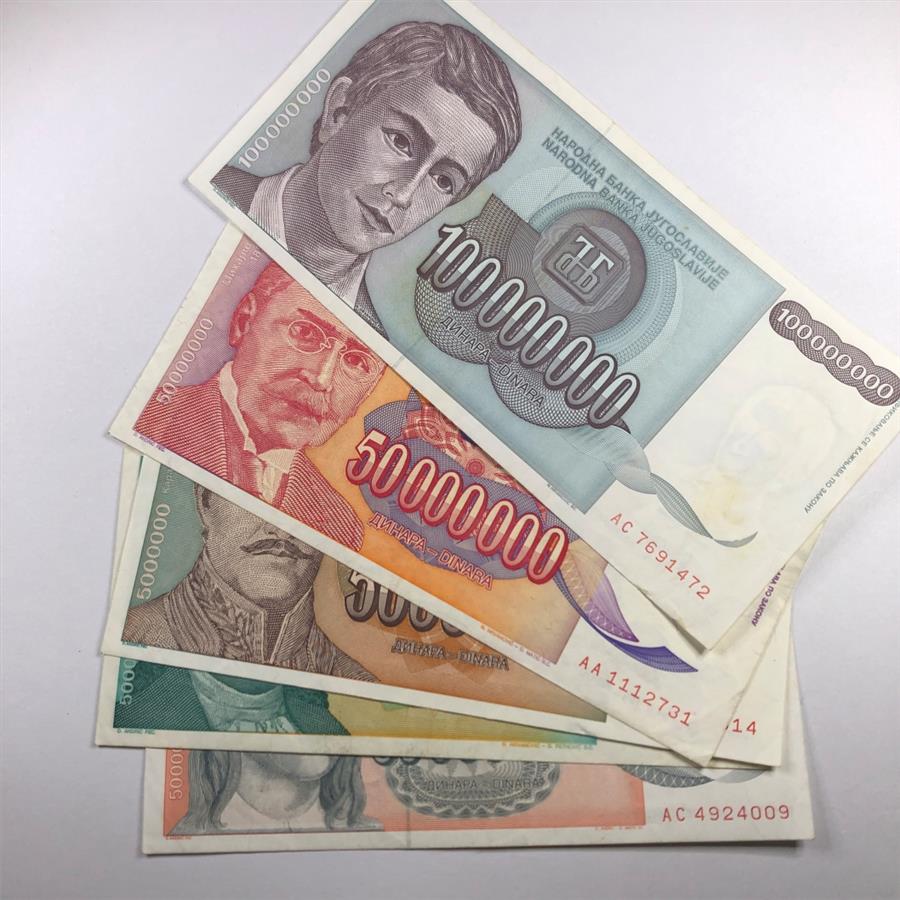 Lot of Five Yugoslavia Bank Notes: 5000000 Dinara, 50000 Dinara, 100000000 Dinara and 50000000 Dinara
