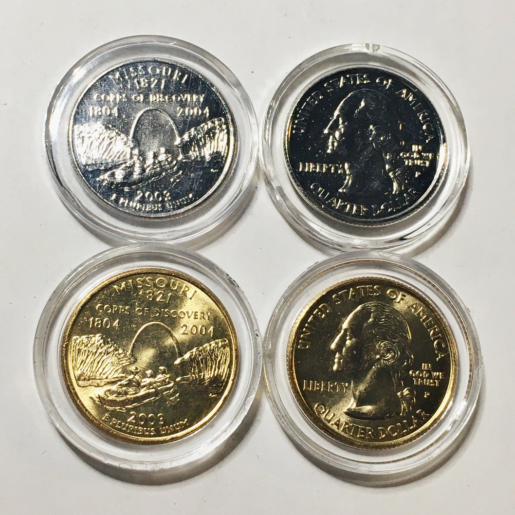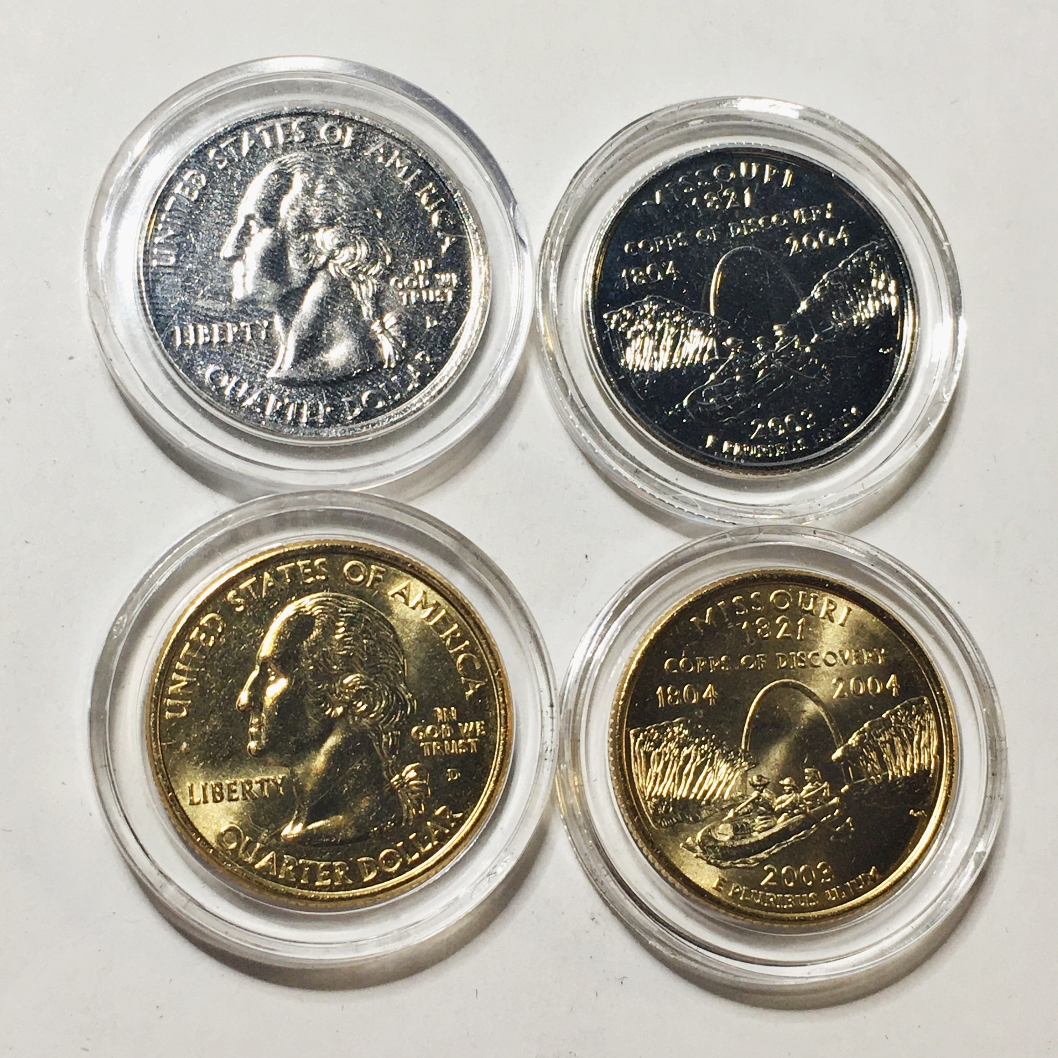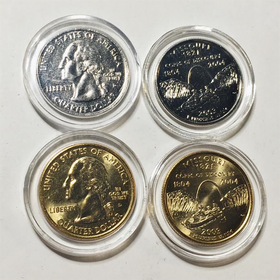 Lot of Four 2003-P & D Missouri State Commemorative Quarters*Two Are 24K Gold Layered and Two Are Platinum Layered
