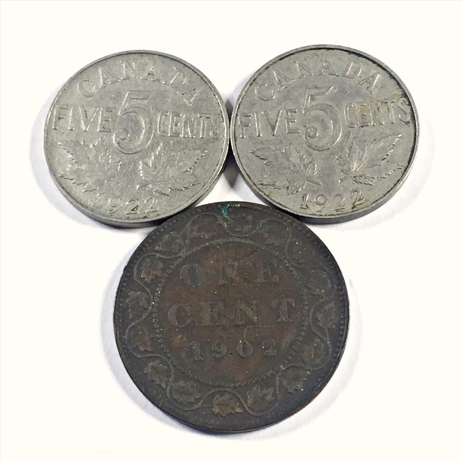 Lot of Three Canadian Coin: 1902 1 Cent, 1922 5 Cents and 1922 5 Cents