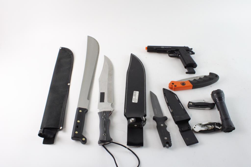 Get a great deal with this online auction presented by PropertyRoom.com on behalf of a law enforcement or public agency client. - Machetes, folding knives, flashlight, colt 1911 bb pistol