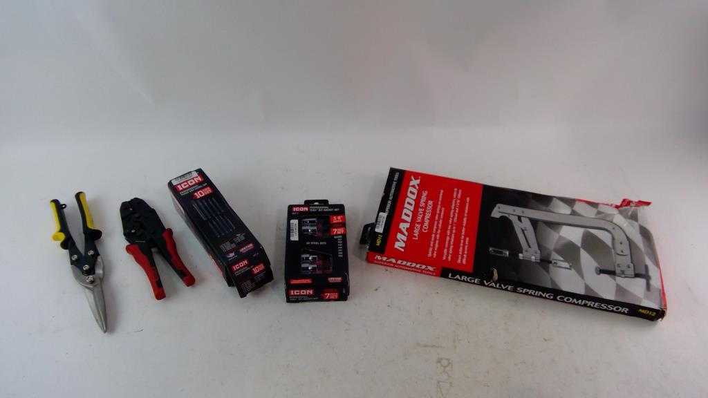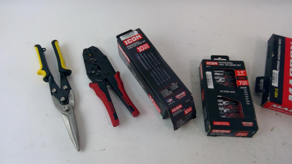 Get a great deal with this online auction presented by PropertyRoom.com on behalf of a law enforcement or public agency client. - Icon Punch and chisel set, Icon Socket set, Snips and more
