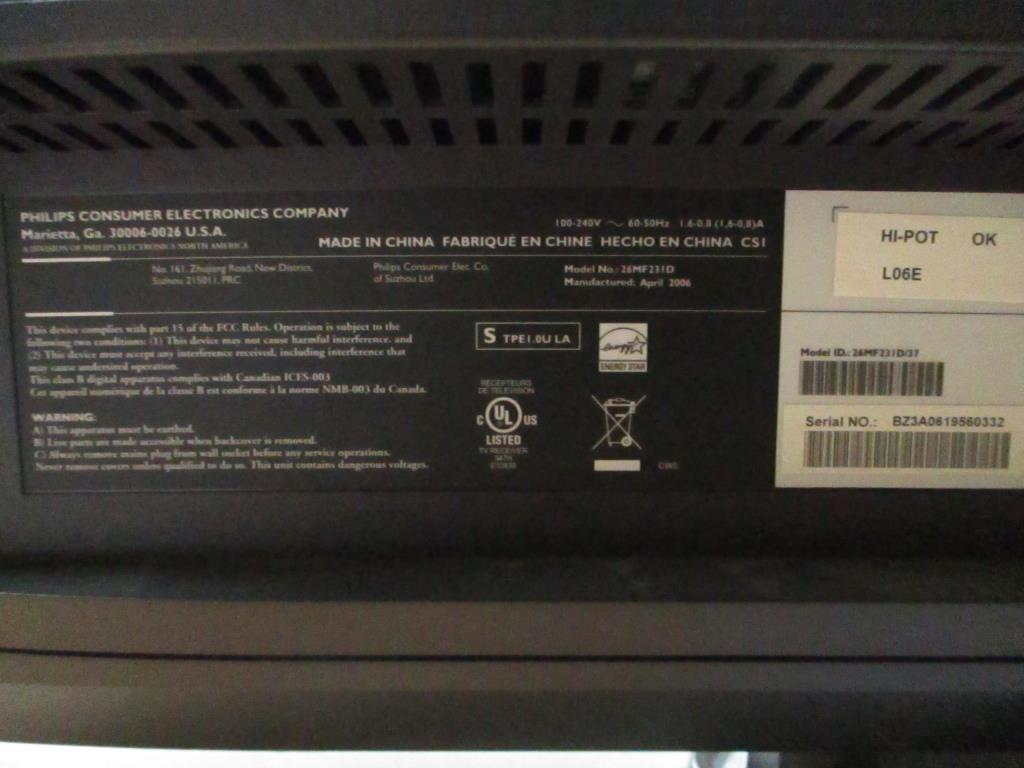 Get a great deal with this online auction presented by PropertyRoom.com on behalf of a law enforcement or public agency client. Model: 26MF23D Screen Size: 26" Date of Manufacture: April 2006 Measurements: height 17" width 32" length 2.9" Base: yes Remote Control: no Power Cord: yes Physical Condition: good, scratches, dirty, nicks Testing Results: Item was tested for power only and it powered on, displayed menu. Input and output ports were not tested and may be non-functional. Item is sold "As Is".