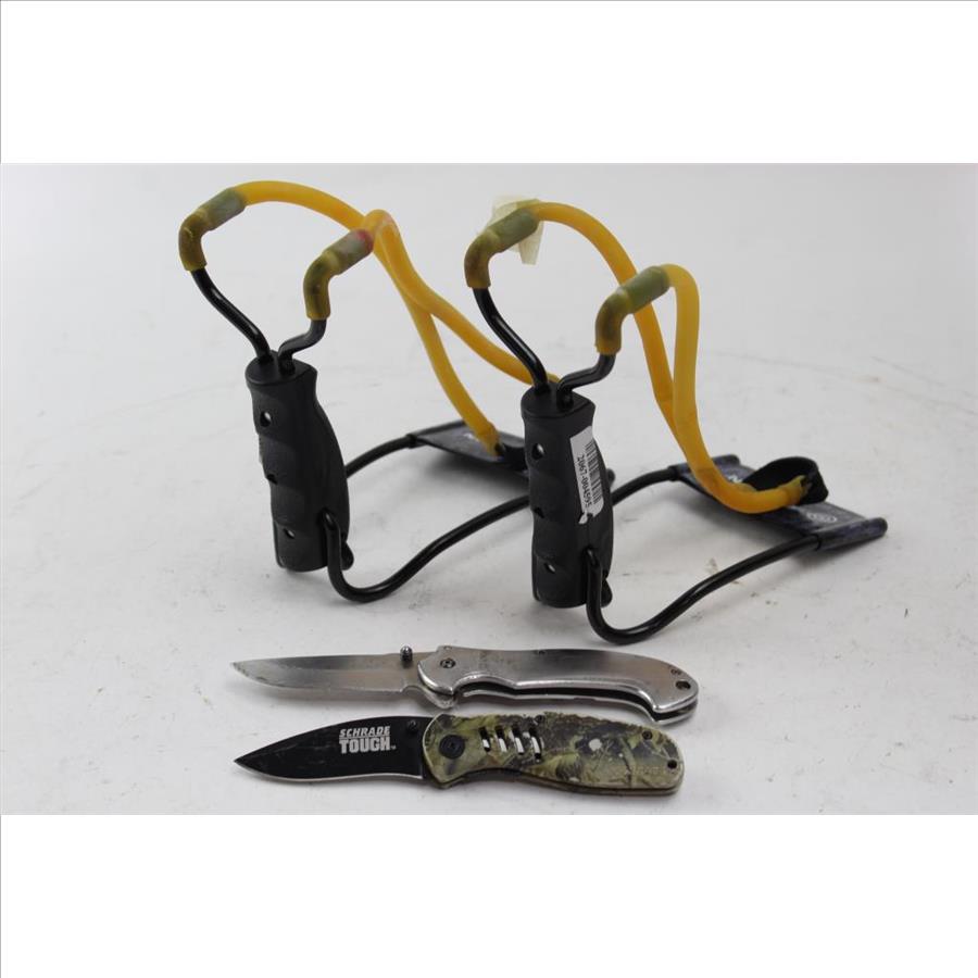 Marksman Slingshots, Schrade And Masters Folding Knives, 4 Pieces