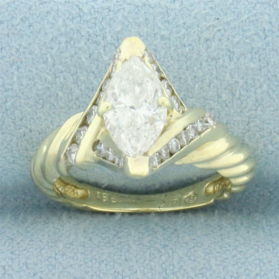 In 14k yellow gold. Contains one high quality 1.1ct Marquise diamond, I color/I clarity, eye clean, great cut for lots of sparkle. Also contains twenty-two high quality .01ct diamonds, I color/SI clarity. Size: 4. 3.9g.