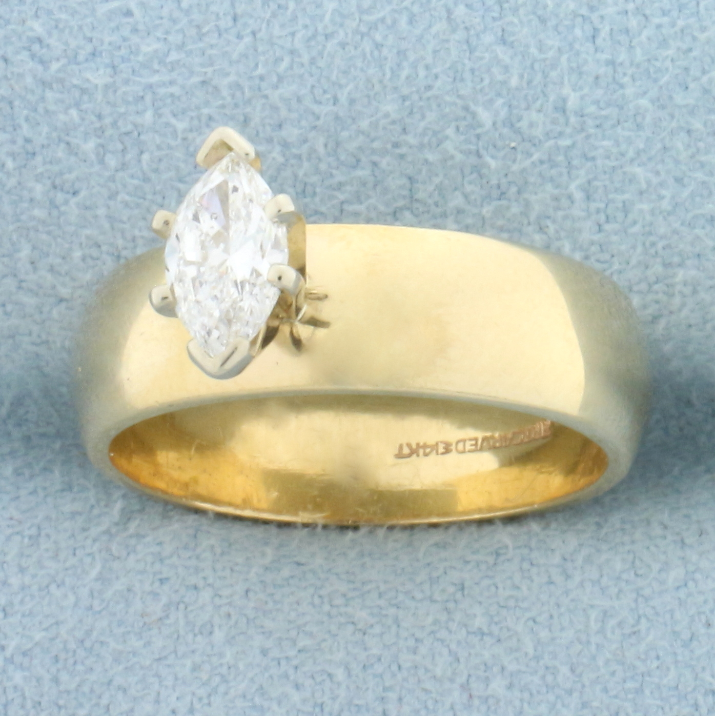 In 14k yellow gold. Contains one high quality 1/2ct marquise diamond, SI1 clarity/F color, completely eye clean and great cut for lots of sparkle. Size 7. 6.3g.