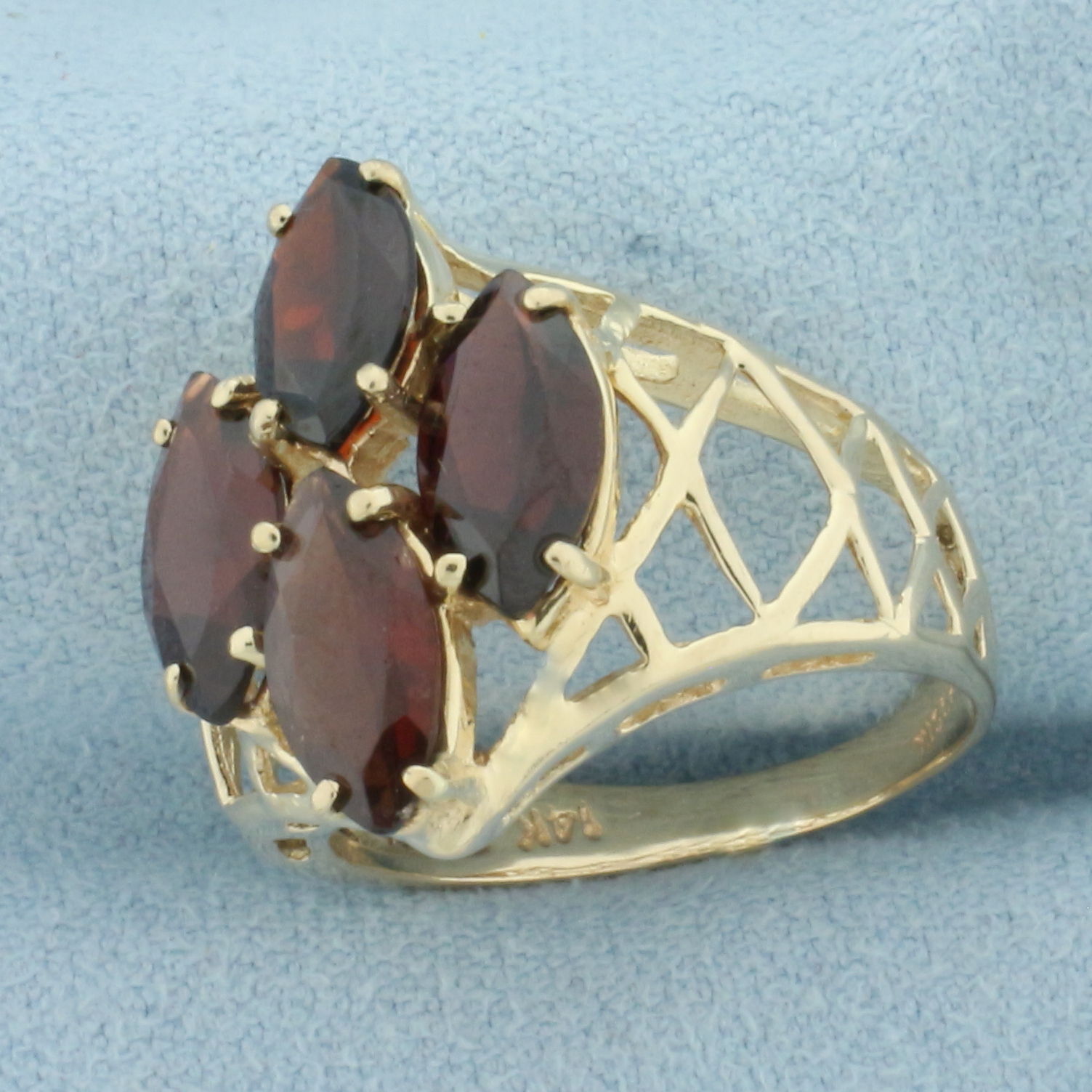 In 14k yellow gold. Contains four high quality 10mm by 5mm marquise cut Garnet gemstones, approximately 1ct each, with vibrant color and excellent clarity. 19mm wide at center. Size :7.25. 4.9g.