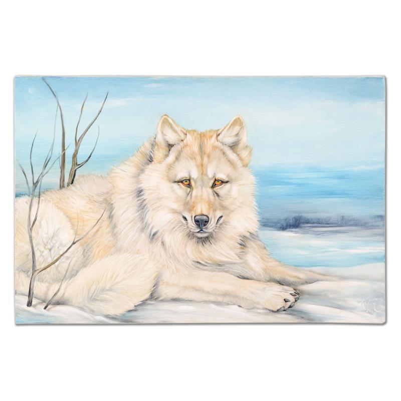 "White Wolf Winter" is an original oil painting on stretched canvas by Martin Katon, hand signed by the artist. Includes Certificate of Authenticity. Measures approx. 36" x 24" (image).