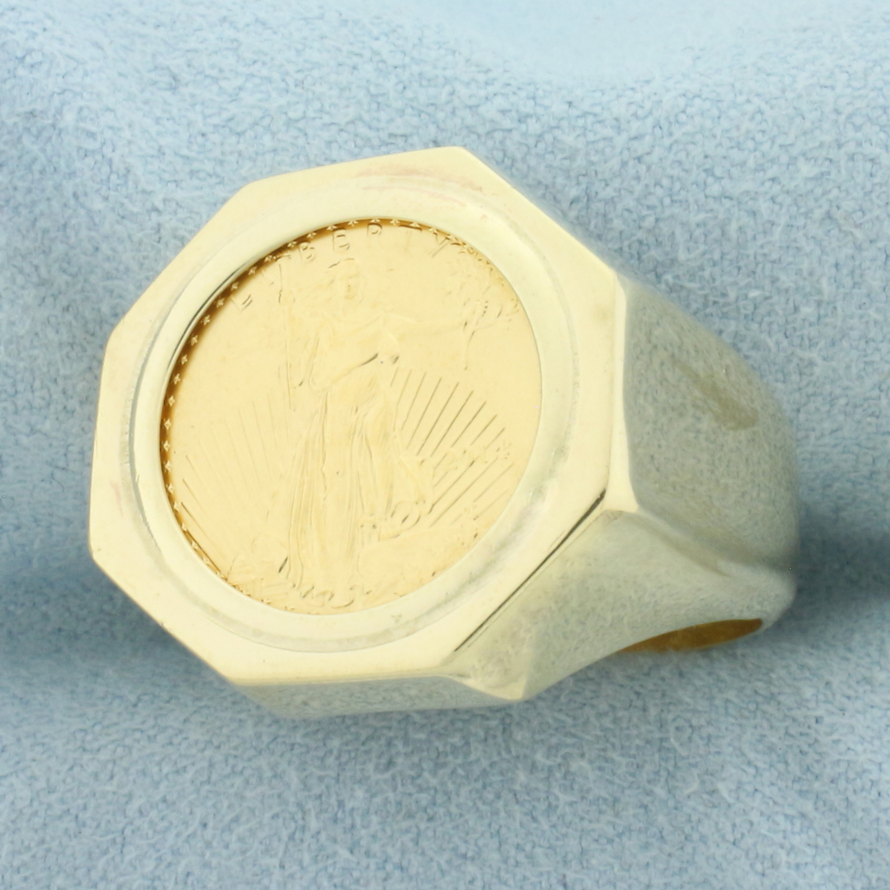 In 14k yellow gold mounting. Contains one 2014 1/10oz American Eagle Bullion gold coin made by US Mint. 19.6mm wide at center of ring. Size 9.25. 16.g.
