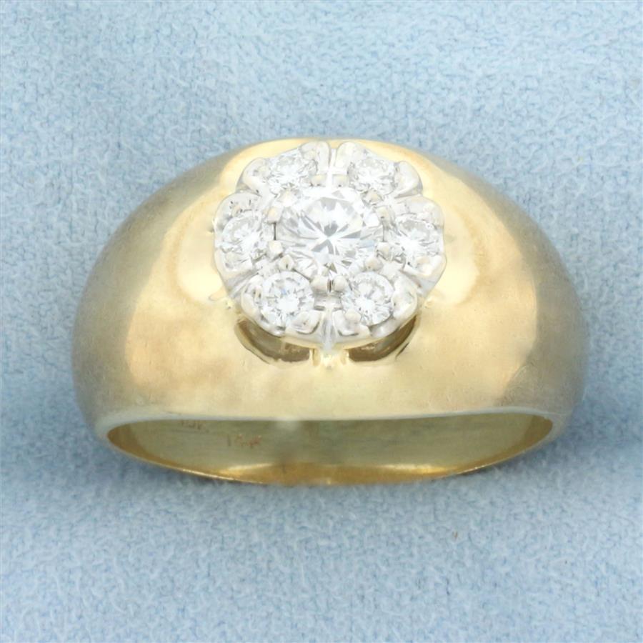 In 10k yellow gold with 14k white gold head. Contains one high quality diamond 2/3ct, SI1/G. Also contains six high quality diamonds, 1/3ctctw, of similar high quality. 15mm wide at center. Size: 12.75. 11.6g.