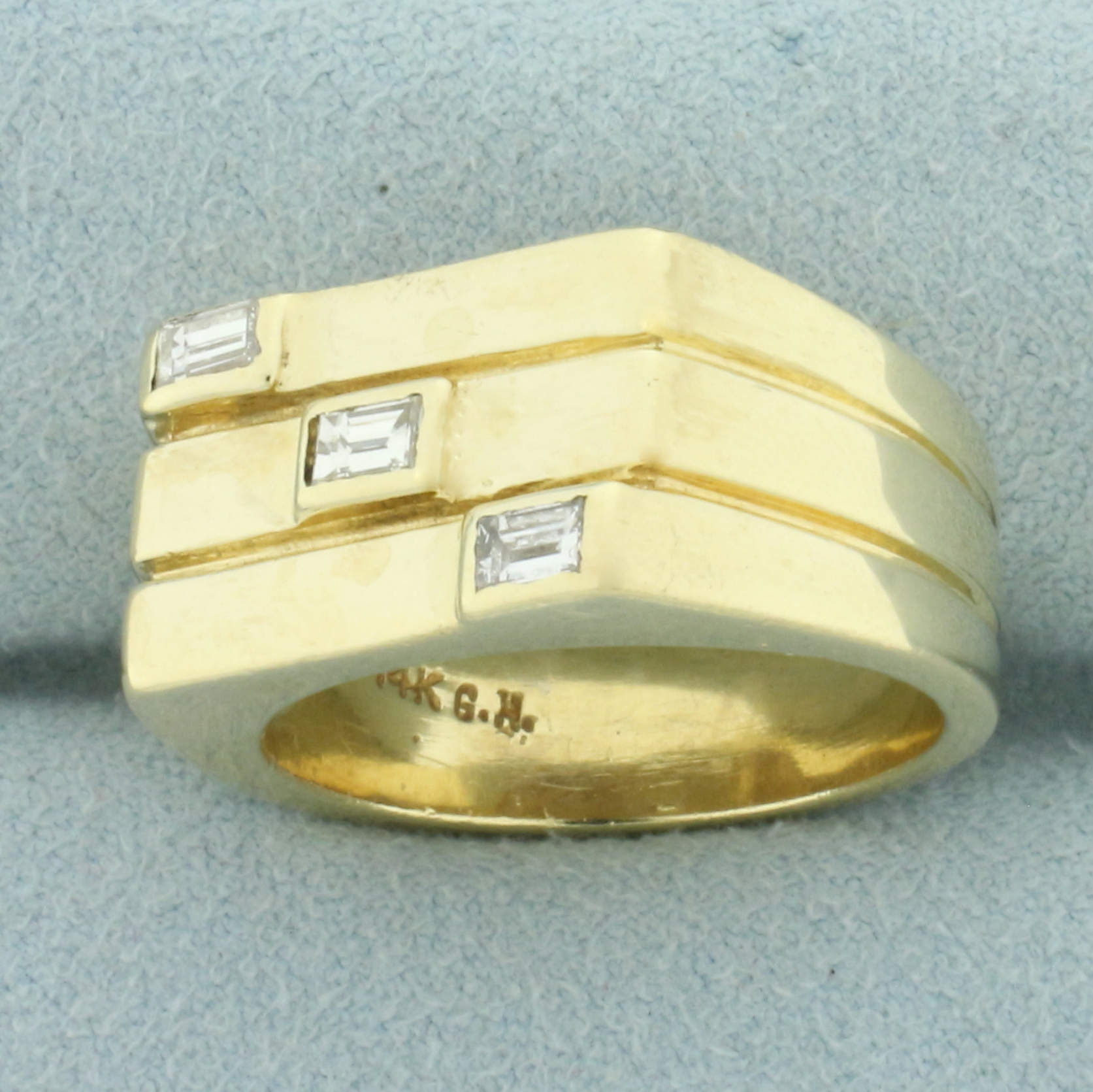 In 14k yellow gold. Contains 3 high quality 4mm by 2mm emerald cut diamonds, 1/3ct TW, VS clarity/G color. Top measures 18mm by 11mm. Size: 9.5. 13.6g.