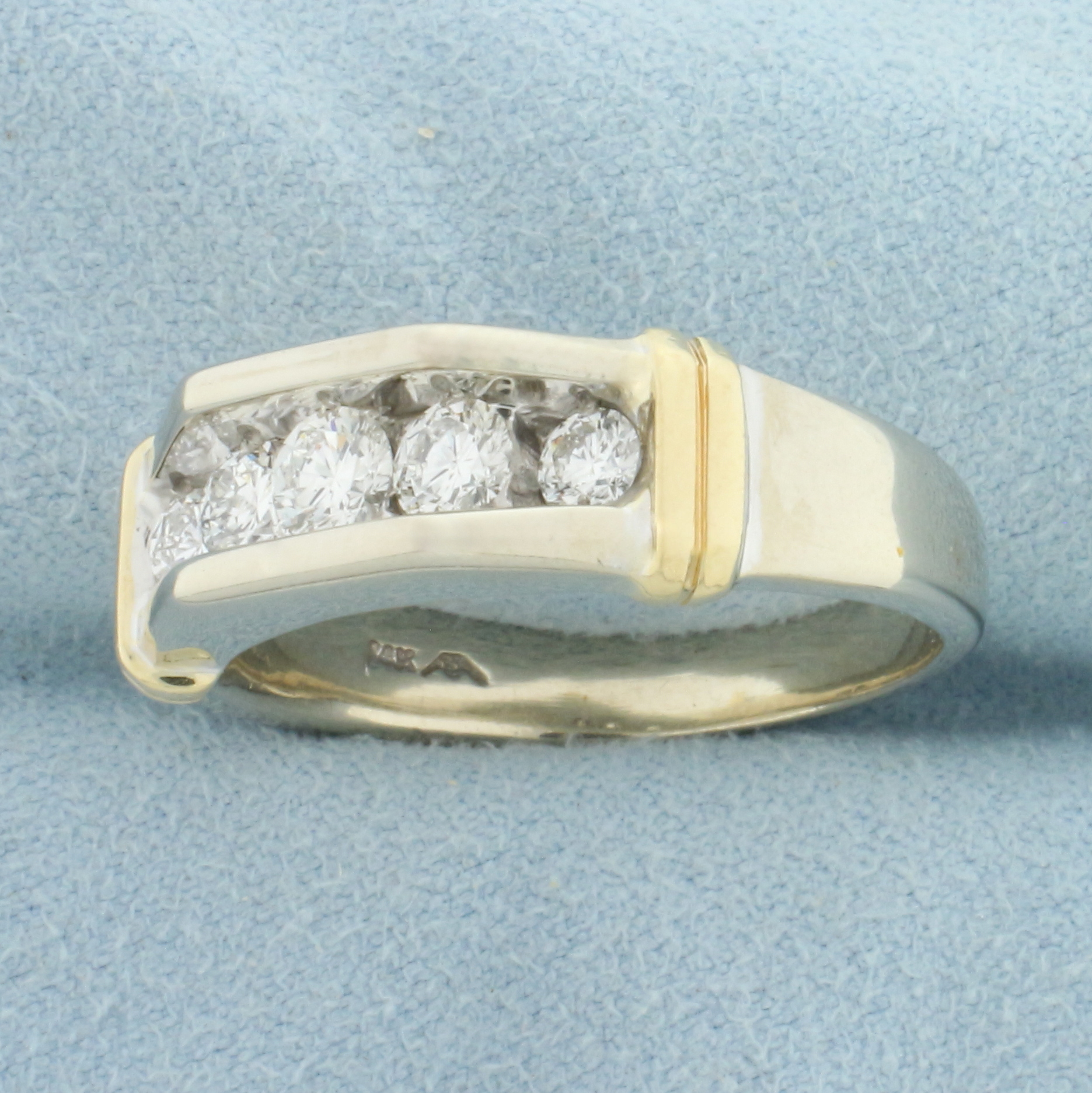 In 14k white gold with 14k yellow gold accents. Features 5 round cut diamonds, one 1/3ct, two 1/5ct and two 1/8ct, 1ct TW, SI clarity/H color, great cut for lots of sparkle. Diamonds are channel set in chamber of high polished white gold for added reflection. Approx. 7.5mm wide at top of Ring. Size 11.75. 11.0g.