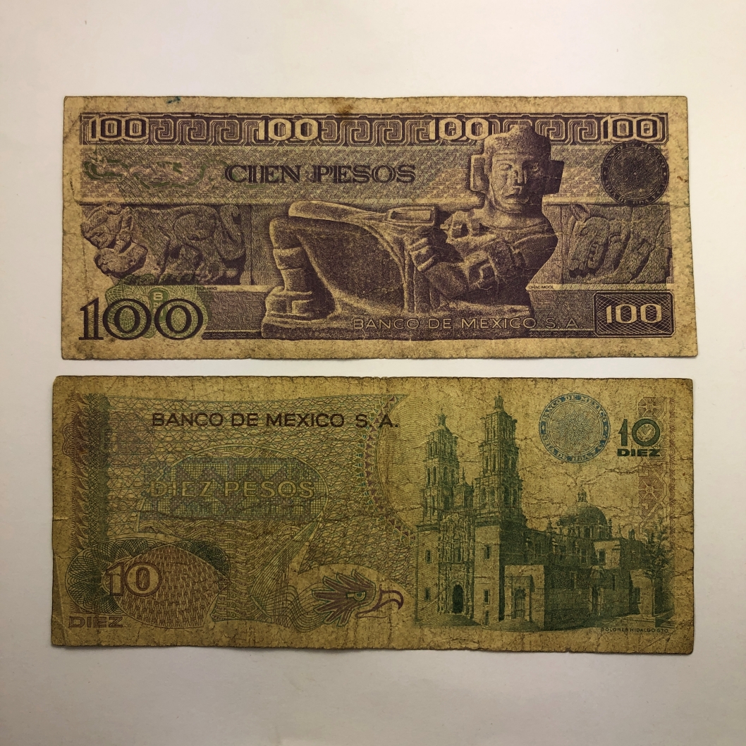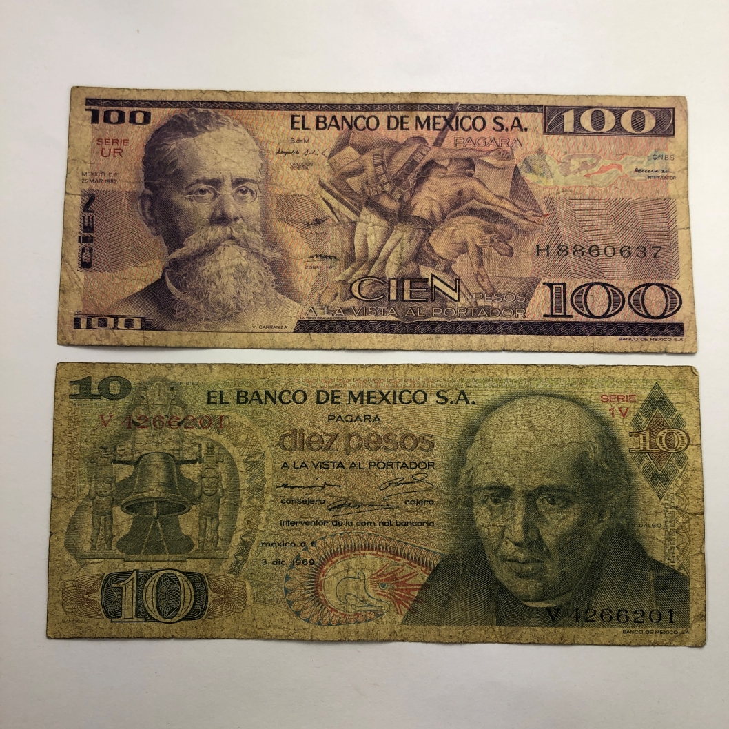 Mexico 10 Pesos and 100 Pesos Banknotes in Protective Sleeve