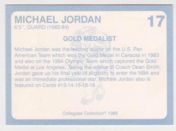 This is an original 1989 North Carolina Michael Jordan #17 college card.  It features him in his college uniform before his superstar NBA days.  It is in approximately EX condition. It has a little corner wear but overall displays pretty well.