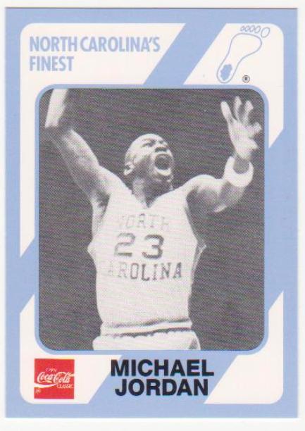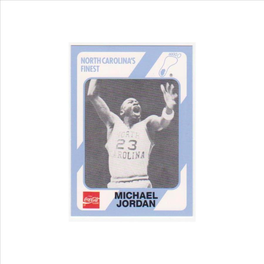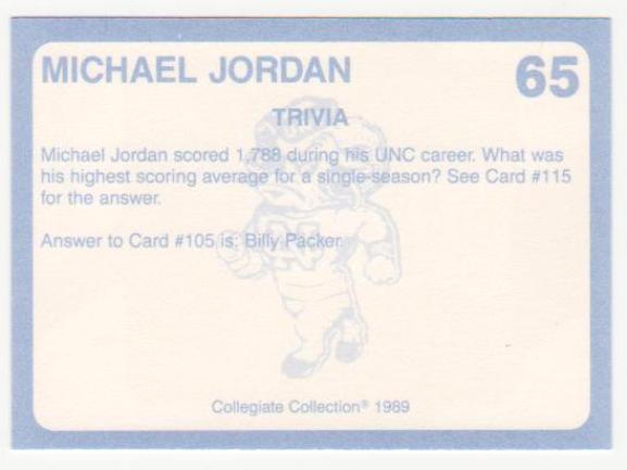This is an original 1989 North Carolina Michael Jordan #65 college card.  It features him in his college uniform before his superstar NBA days.  It is an approximately EX-MT condition card.  There is a tiny surface indentation close to the center on the front, but otherwise this is a nice looking Jordan card.