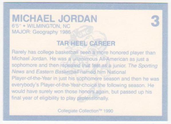 This is an original 1990 North Carolina Michael Jordan #3 college card.  It features him in his college uniform before his superstar NBA days.  It is in approximately EX condition. It has minor wear and a tiny surface scuff on the front, but overall displays pretty well.
