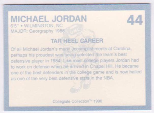 This is an original 1990 North Carolina Michael Jordan #44 college card.  It features him in his college uniform before his superstar NBA days.  It is in approximately EX condition.  It has a little wear on the top left corner, but otherwise displays nicely.