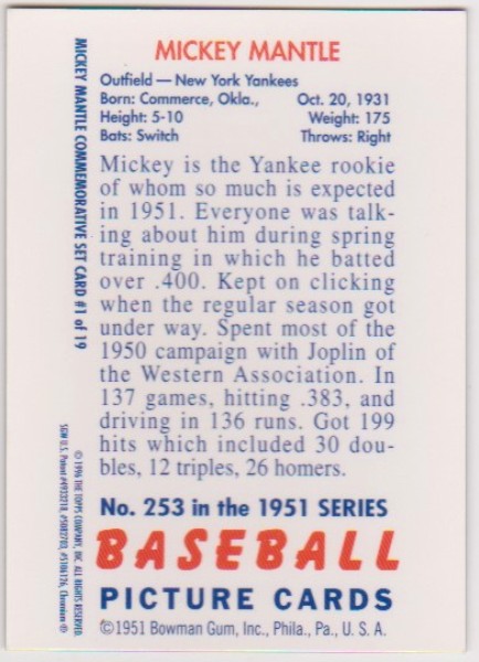 Mickey Mantle 1951 Bowman #253 Commemorative Card - 1996 Topps Finest #1 of 19 Insert Card