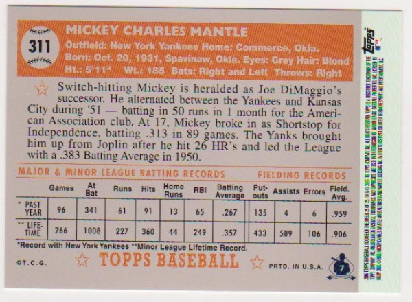 Mickey Mantle 1952 Topps #311 Rookie Commemorative Card - 2006 Topps #25 Rookie Of The Week Card