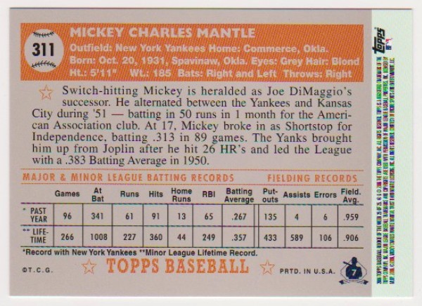 Mickey Mantle 1952 Topps #311 Rookie Commemorative Card - 2006 Topps #25 Rookie Of The Week Card