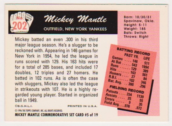 Mickey Mantle 1955 Bowman #202 Commemorative Card - 1996 Topps #5 of 19 Insert Card