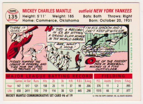 Mickey Mantle 1956 Topps #135 Commemorative Card - 1996 Topps #6 of 19 Insert Card