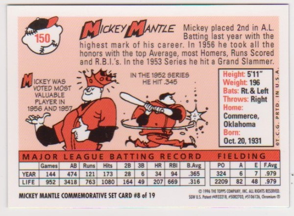 Mickey Mantle 1958 Topps Finest #150 Commemorative Card - 1996 Topps #8 of 19 Insert Card