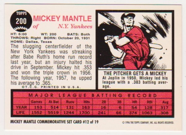 Mickey Mantle 1962 Topps #200 Commemorative Card - 1996 Topps #12 of 19 Insert Card