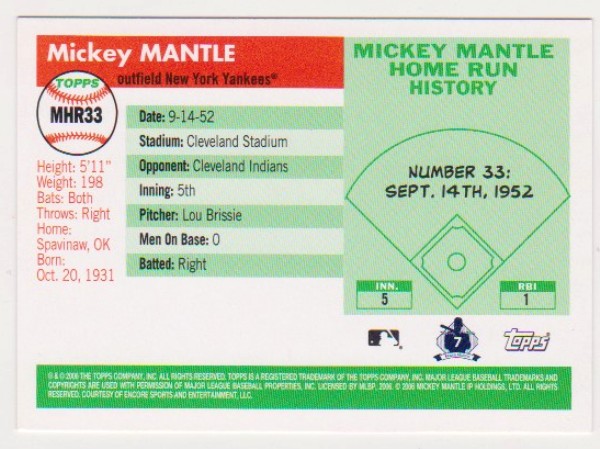 Mickey Mantle '55 Topps Style HR #33 2006 Topps #MHR33 Insert Card