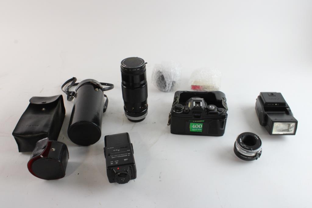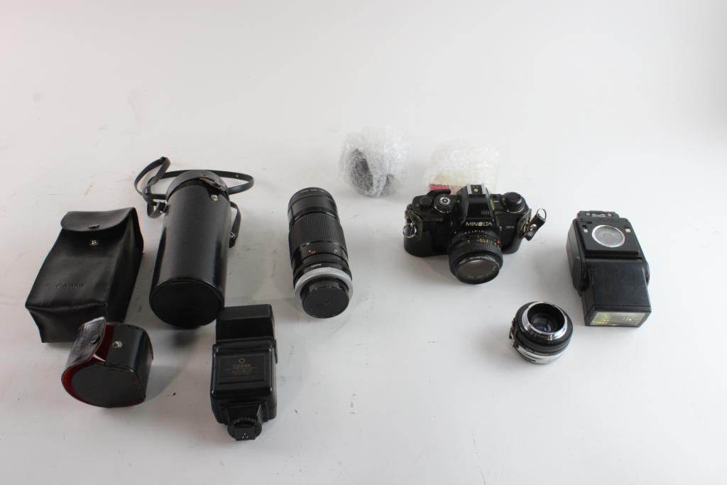 - Accessories: Flashes, several lenses including osawa 55mm vari-cross, minolta MD 50mm 1:1.7 49mm, filters