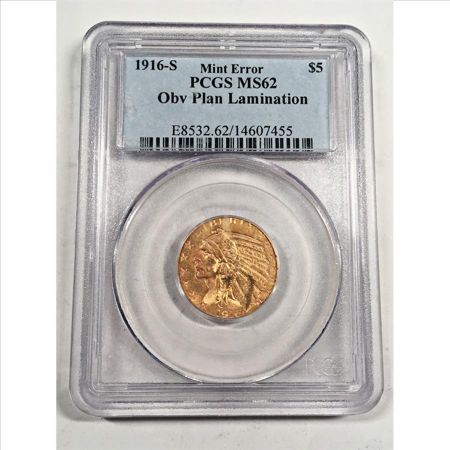 MINT ERROR*1916-S $5 Indian Head Gold Half Eagle*Graded MS62 obv Plan Lamination by PCGS