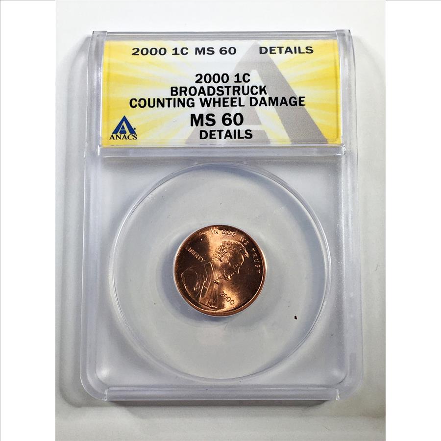 MINT ERROR*2000 Lincoln Head Memorial Cent*Broadstruck-Counting Wheel Damage*Graded MS60 Details by ANACS