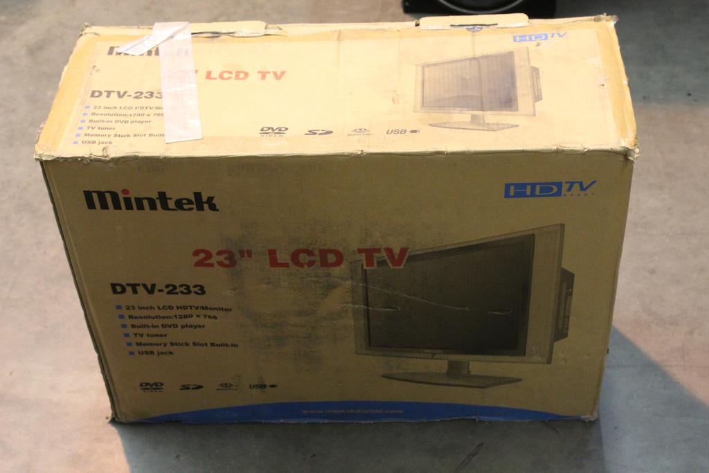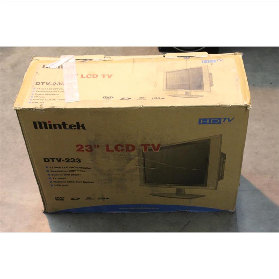 Get a great deal with this online auction for a TV presented by Property Room on behalf of law enforcement or public agency client. Model: Mintek Dtv-233 Hd Tv Ready 23 Inch Lcd Tv DVD Combo Upc: 837815002109 Screen Size: 23" Date of Manufacture: not listed Approx Measurements: 18" tall Base: included Remote Control: included Power Cord: included Physical Condition: Good condition, appears minimally used, has some visible wear, is a little dirty Testing Results: Item was tested for power and it powered on, displayed menu. Dvd reads and plays. Input and output ports were not tested and may be non-functional. Item is sold "As Is".