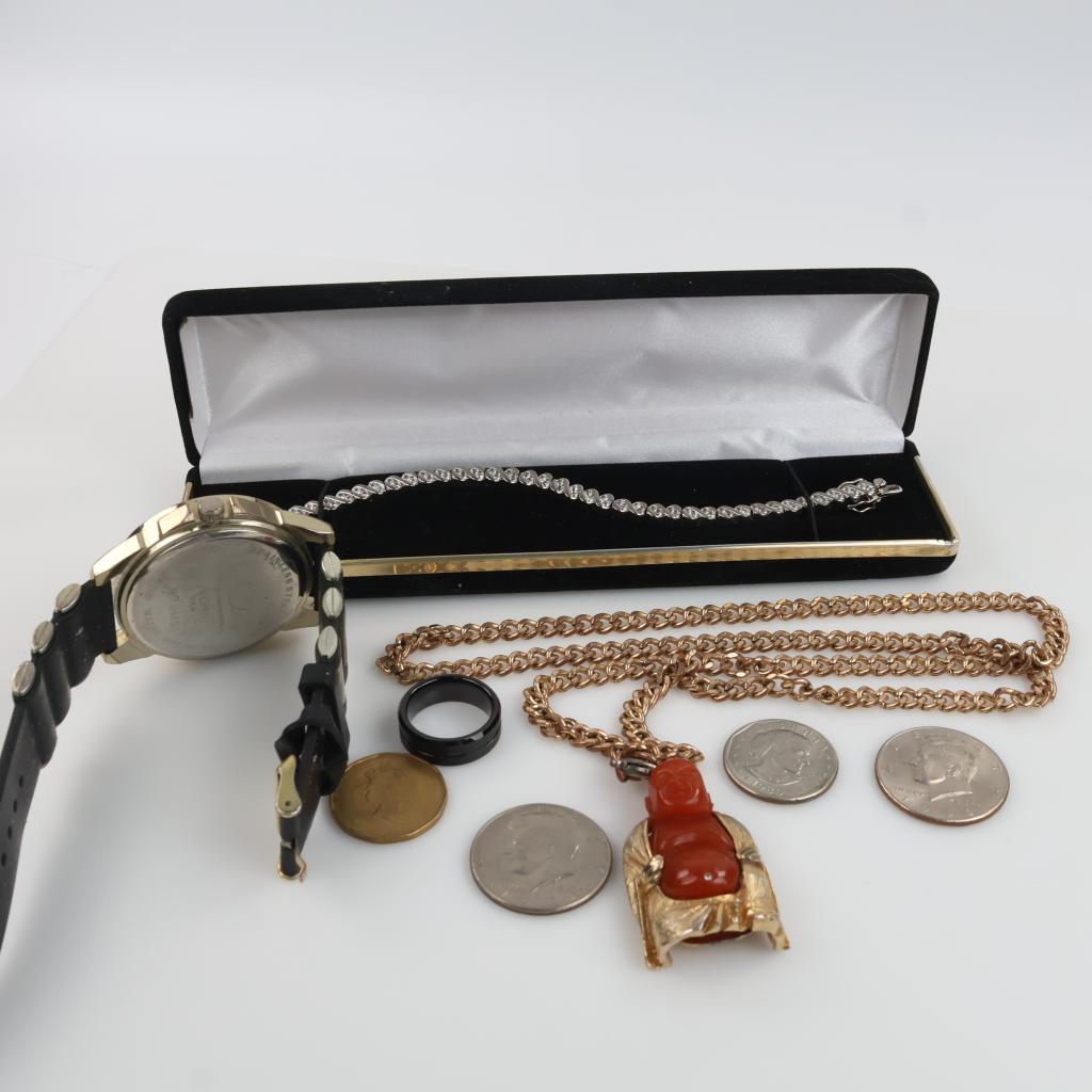 Mixed Jewelry And Watch With US And Foreign Coins, 5+ Pieces