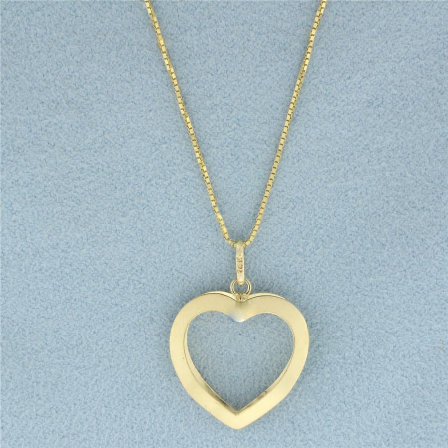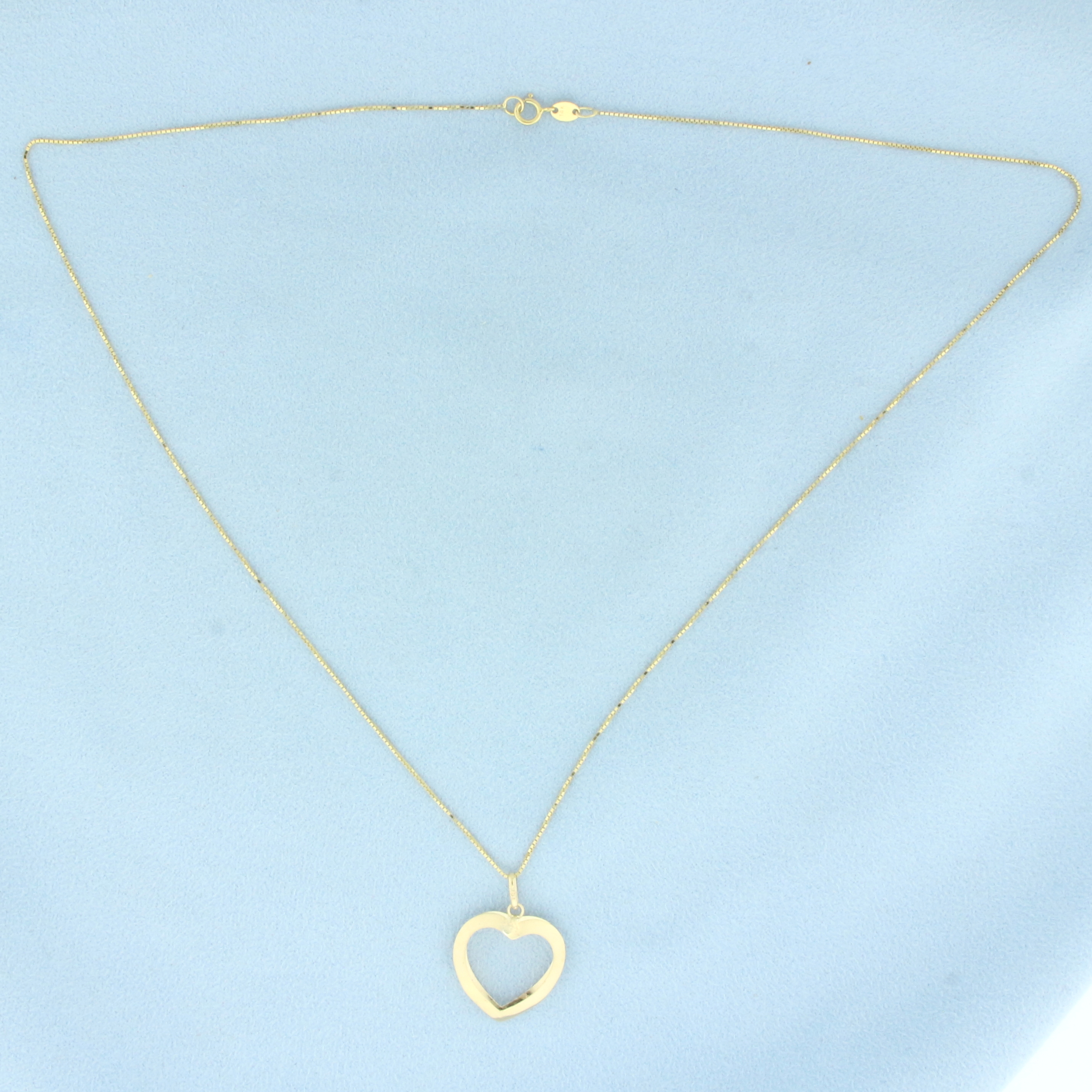 In 14k yellow gold. Box link chain is 18 inches long, .6mm thick, spring clasp. Pendant is 1 inch long (including bale) and 5/8 inches wide. 2.0g.