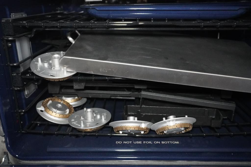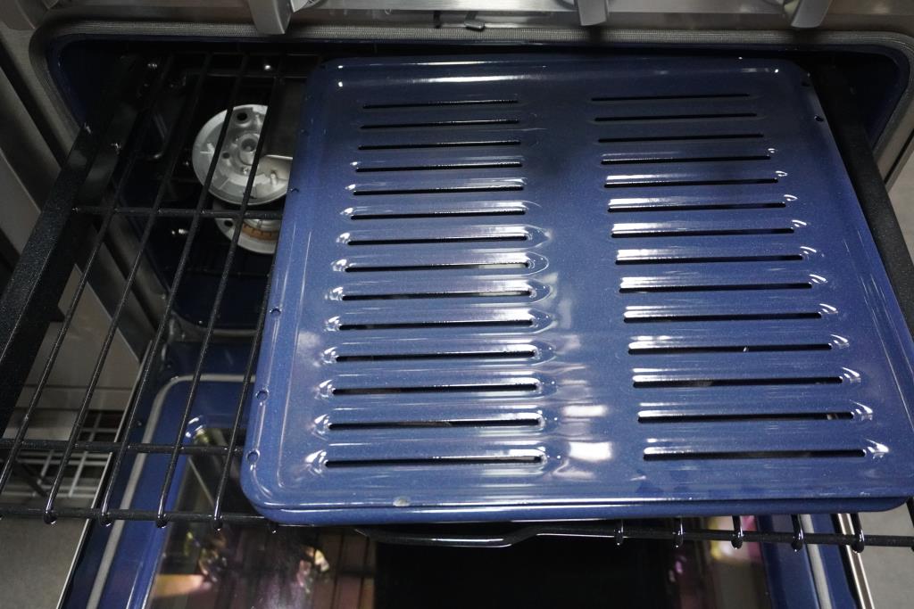- Burners and trays are located in the oven