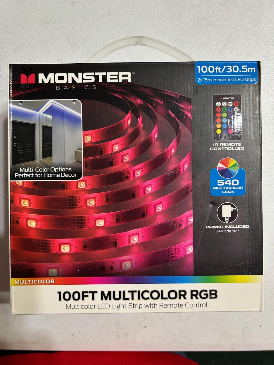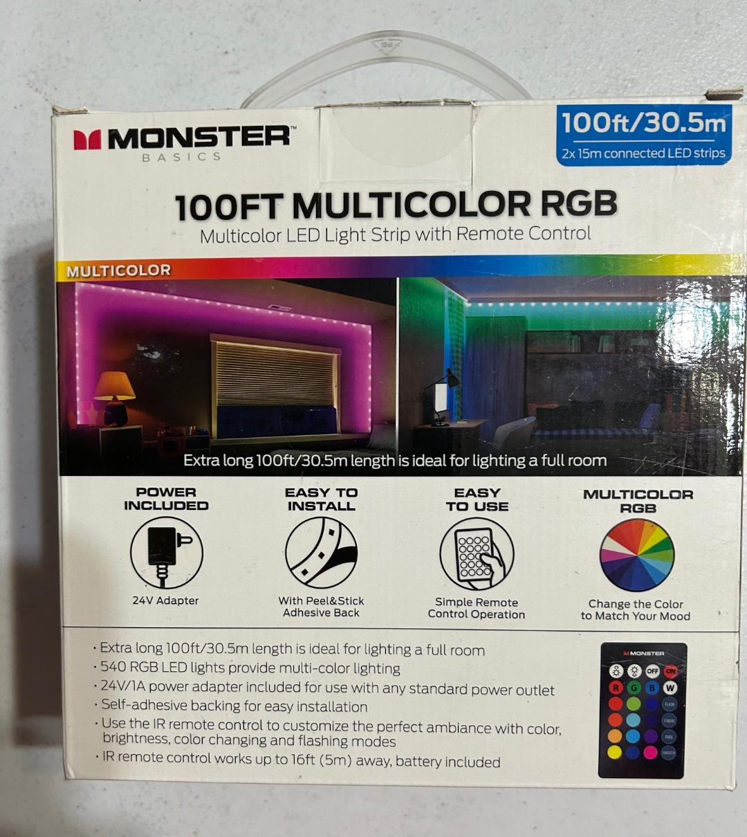 Add some color to your environment with the Monster 100 ft LED Light Strip. This multi color LED Light Strip features vibrant diffused light and spans a staggering length of 2 rolls of 50ft., which gives you the range to cover large indoor spaces such as bedrooms, living Room, kitchen, ceilings, walkways, stairs and more. The Monster Light Strip is dimmable and made from a durable material. The Remote Controller gives you the greatest control of color, brightness, speed, and color-changing modes. Installation’s a breeze, just peel, stick and the strip easily fits to any surface. These LED Strip indoor lights make it easier than ever to add some ambiance to your environment!