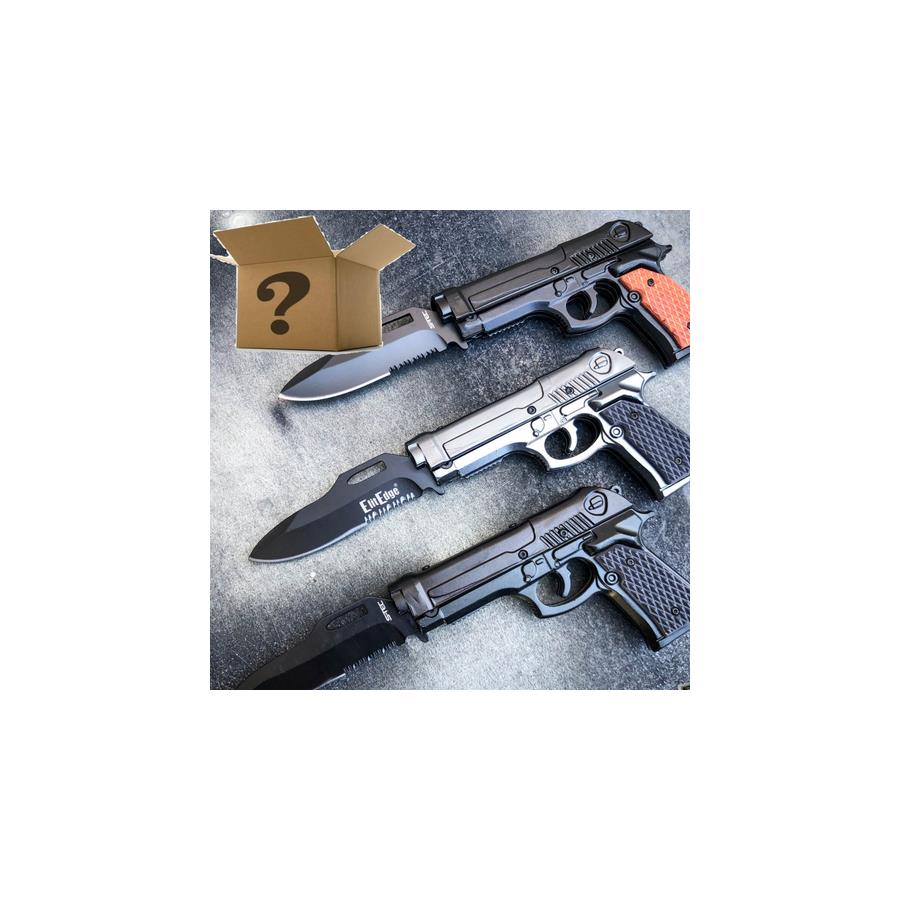 You will receive 1 NEW Mystery Gun Knife.  Knives are spring assisted and have the appearance of a gun or pistol with spring assisted blade. Ranges in style and colors.