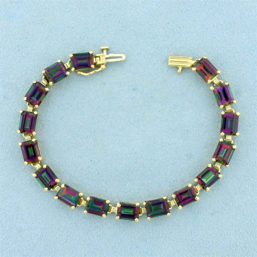 In 14K Yellow Gold. Contains sixteen high quality natural 8x6mm mystic topaz gemstones, 24ct TW, with vibrant color and excellent clarity. 7 inches long, 6.9mm wide. Safety clasp. 16.2g.