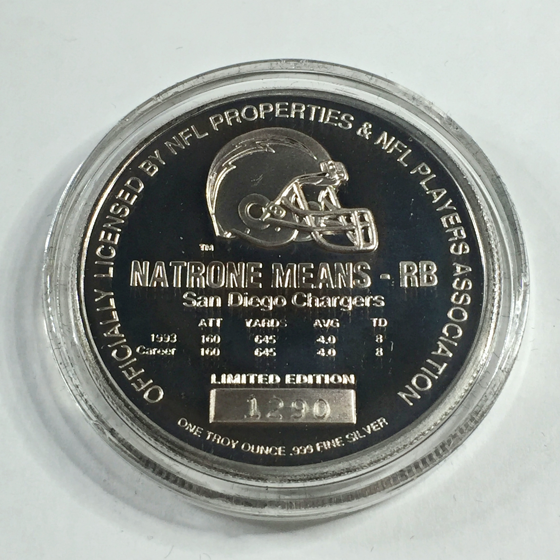 Natrone Means NFL 1oz .999 Fine Proof Silver Commemorative Medallion*#1290 of 7500*In Display/Gift Box