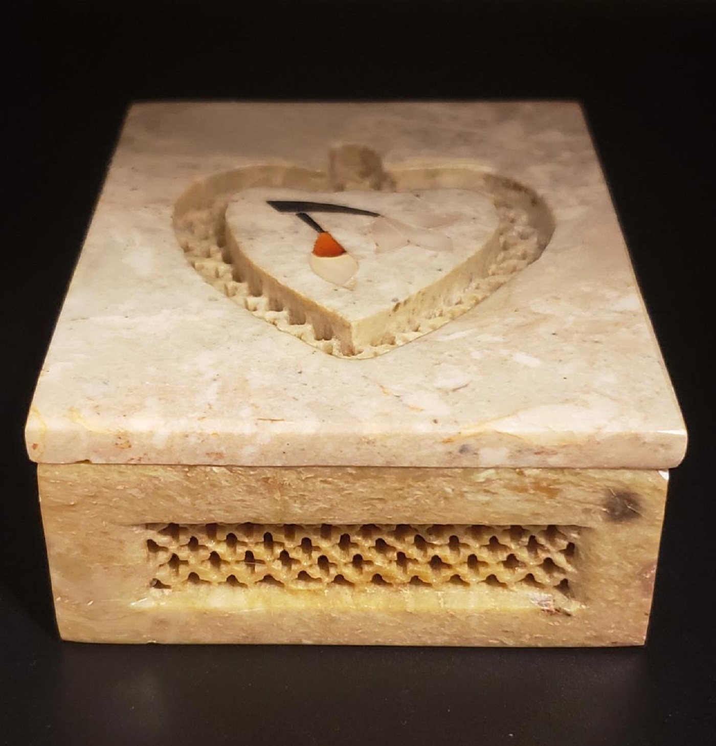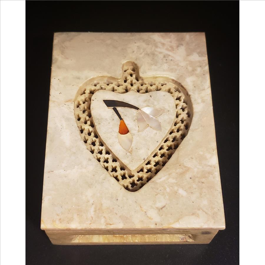 Beautiful heart shaped hand carved, inlaid floral sea shell on the lid