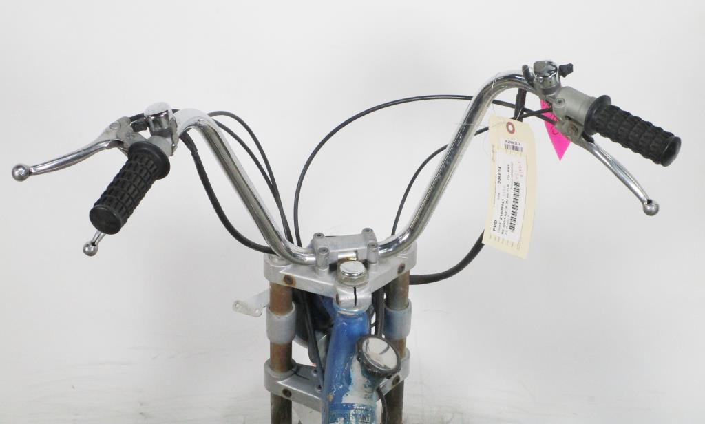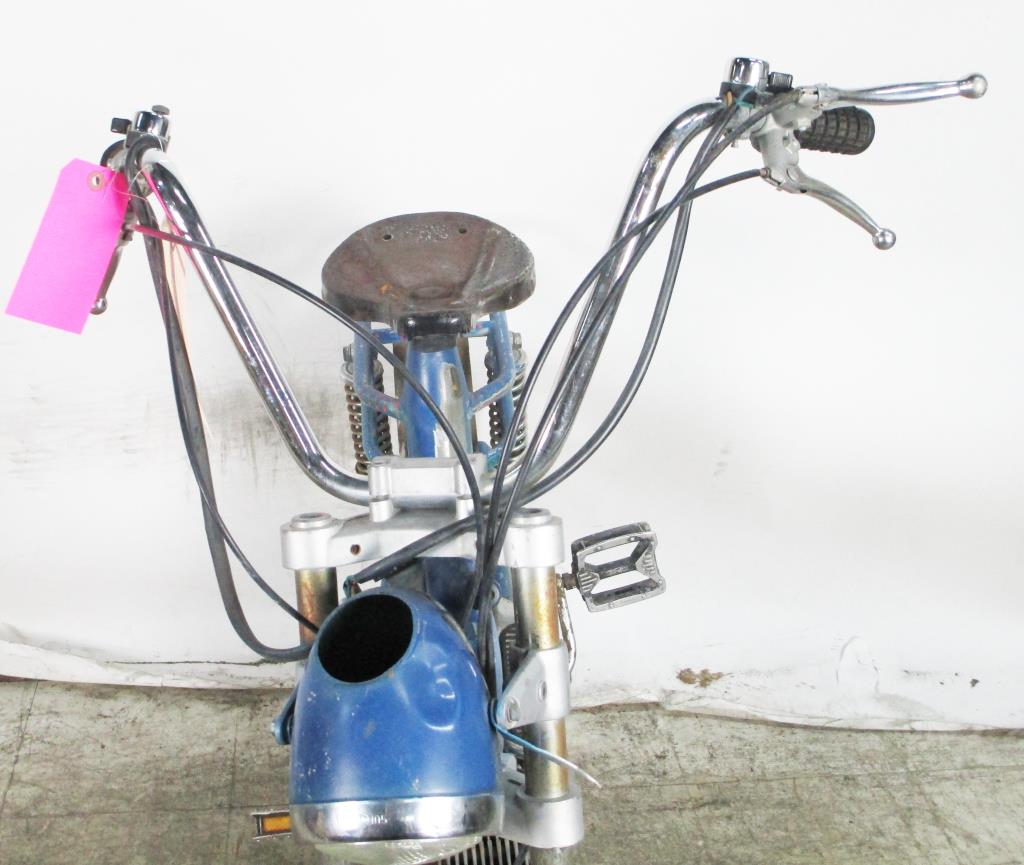 - Gas powered, bike pedals, brakes & clutch on hanlde bars, head and tail lights, Morini Franco motor, kick stand.
