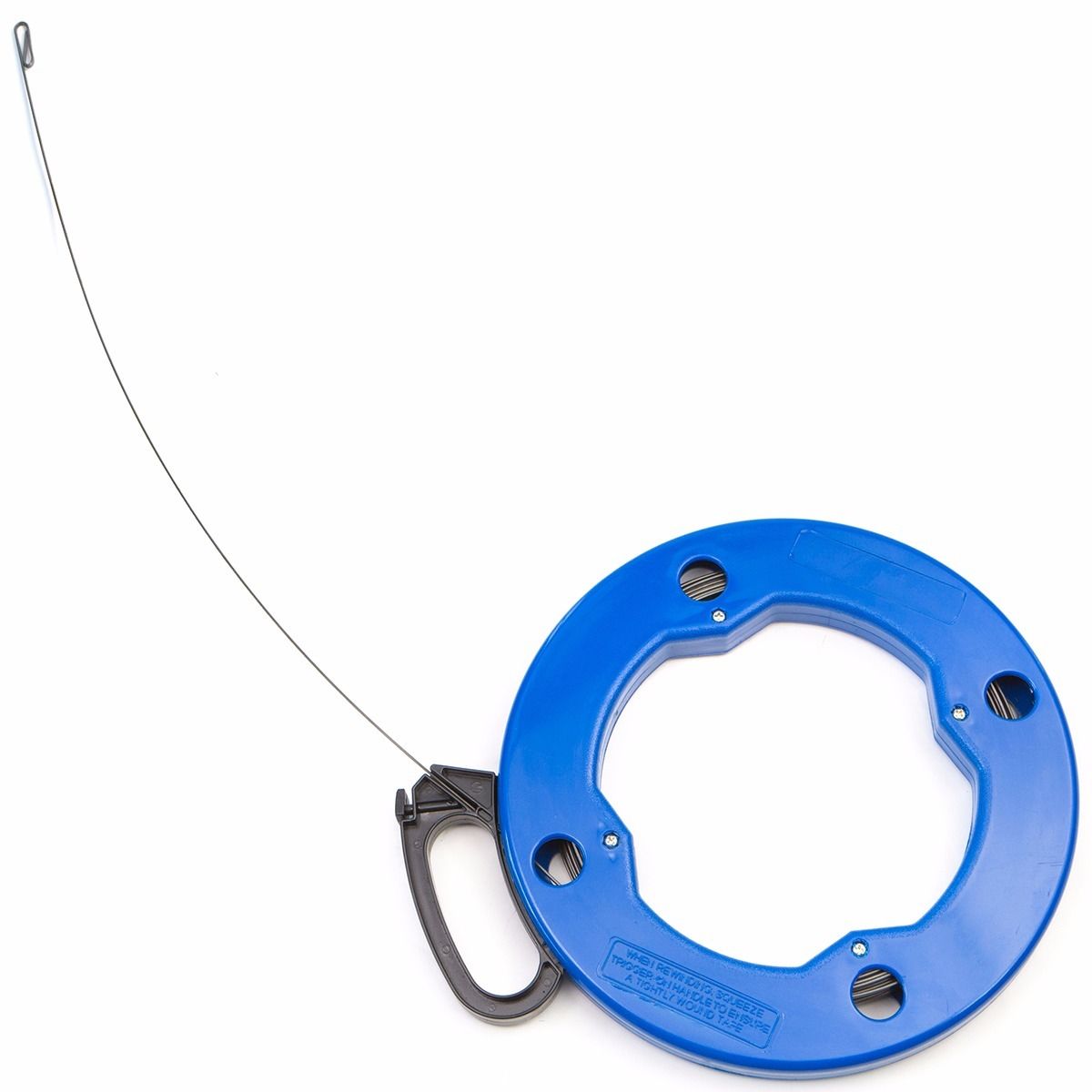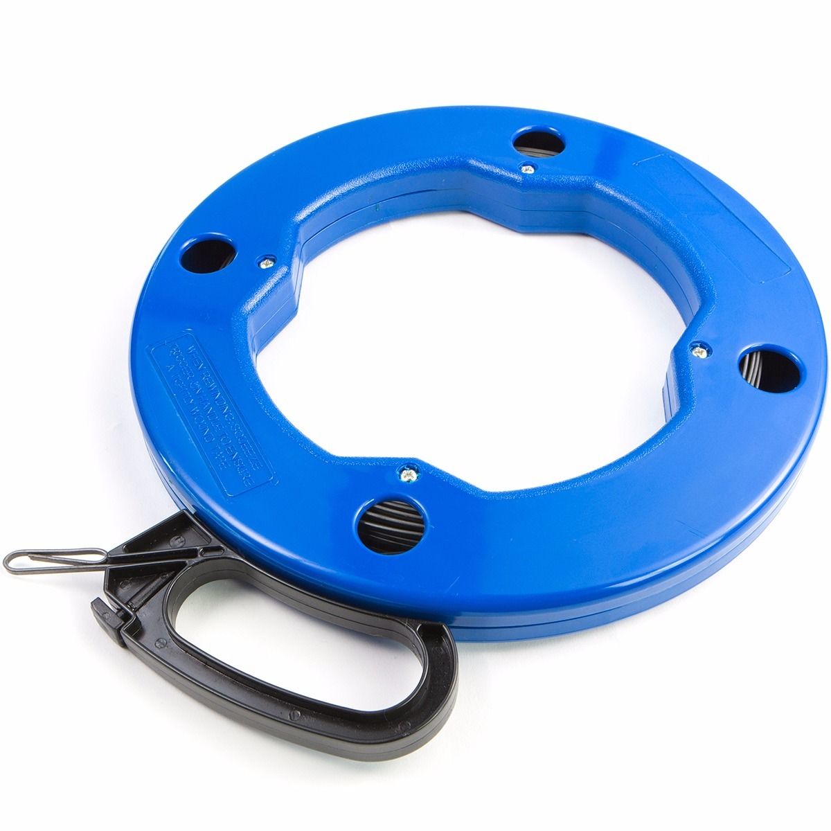 50 foot fish tape with a high impact plastic case and durable comfort grip handle for pulling electrical or communication wires.