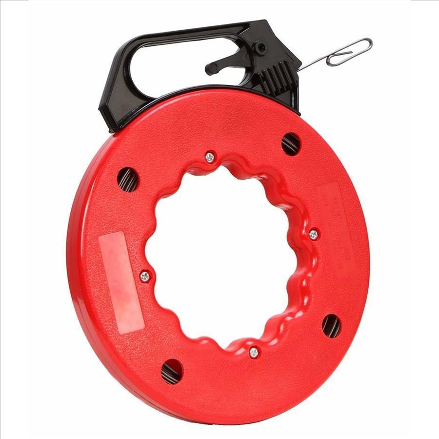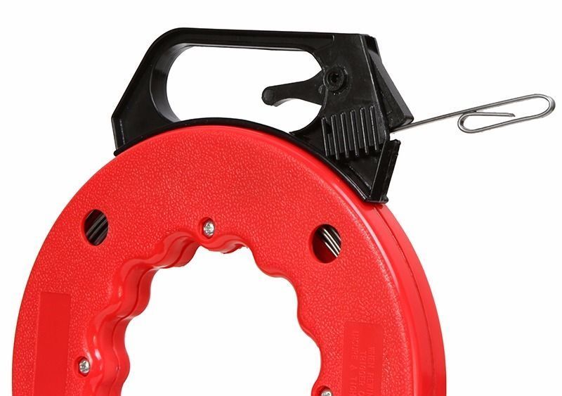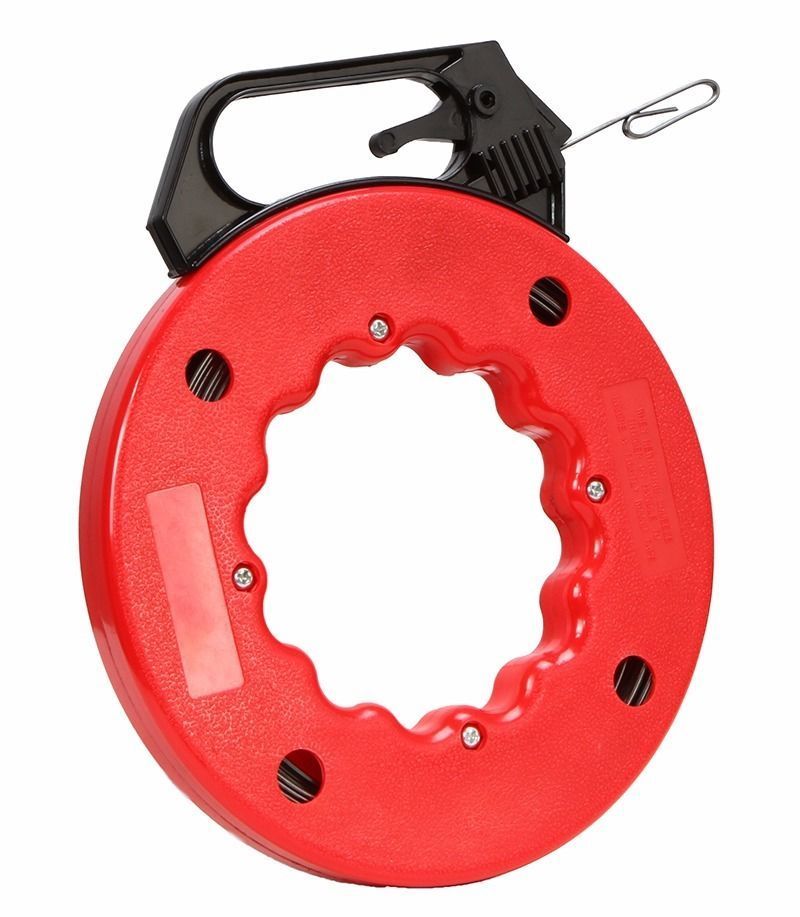 50 foot fish tape with a high impact plastic case and durable comfort grip handle for pulling electrical or communication wires.