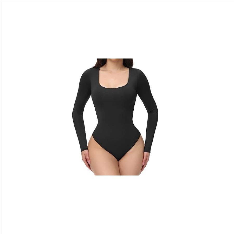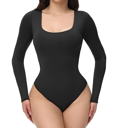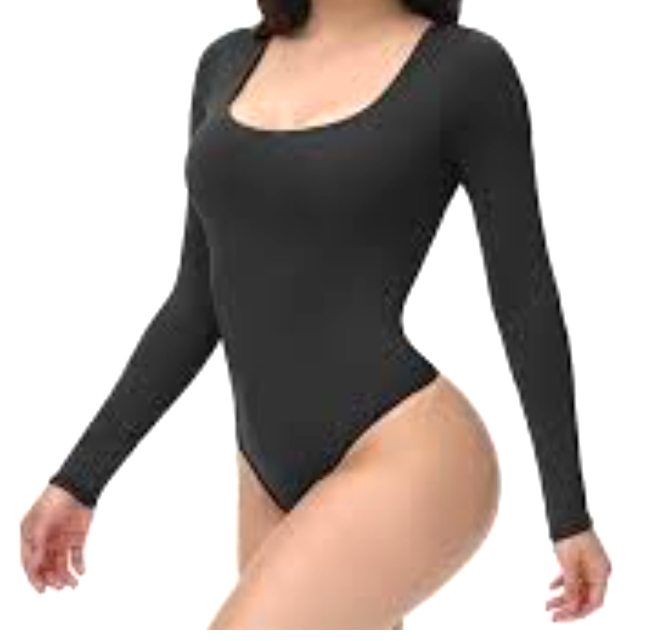 Long sleeve, square neck shape, stretchable fabric, body fit, snap button to close