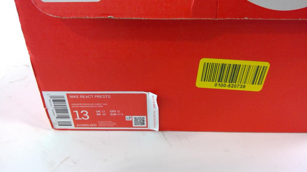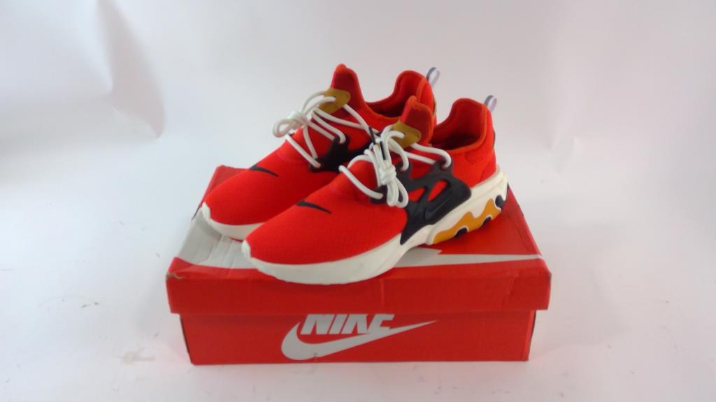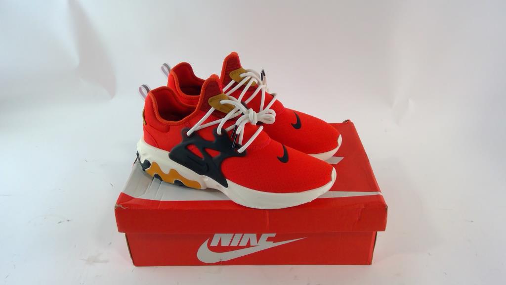 Get a great deal with this online auction presented by PropertyRoom.com on behalf of a law enforcement or public agency client. Style/Model: Nike react presto Size: 13 Color: Habanero red/black wheat Physical Condition: New in Box Condition: New