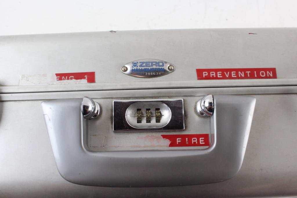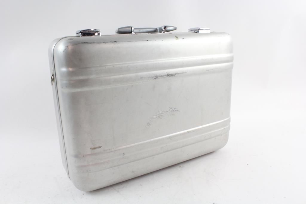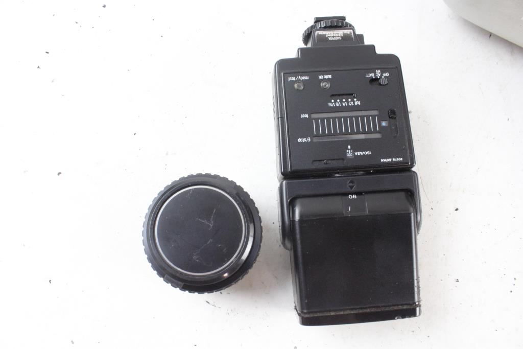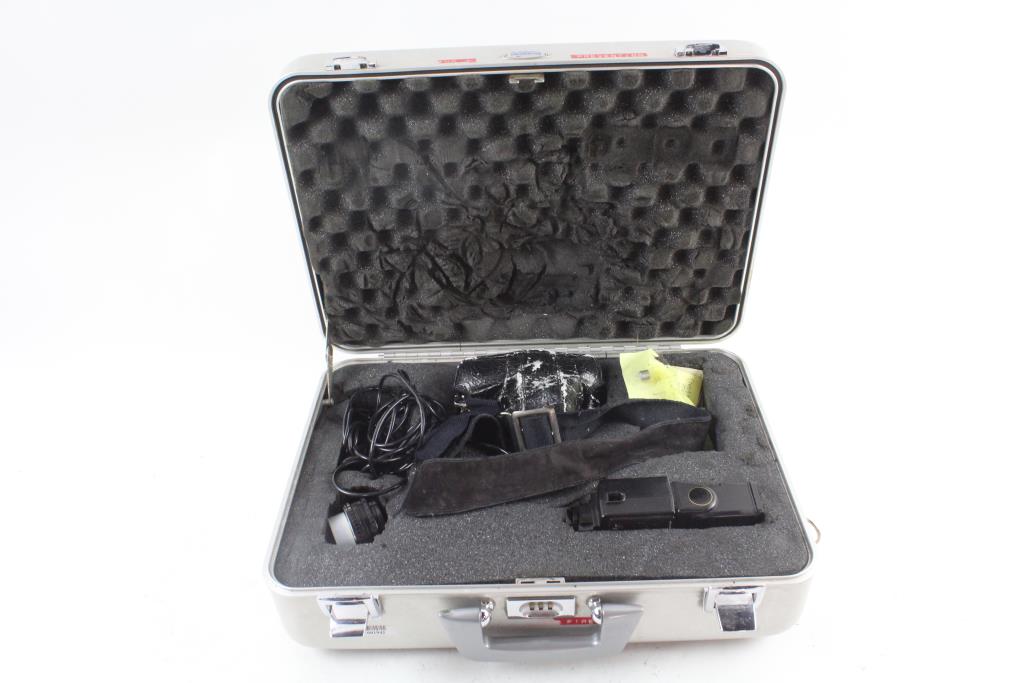 - Accessories: Sunpak camera flash, 50mm lens, leather camera pouch. Halliburton Zero metal combination lock case (combination unknown, case unlocked. Closes and opens without combo input)