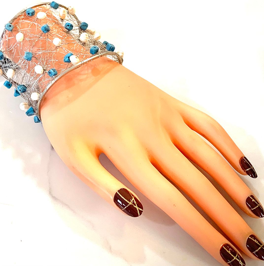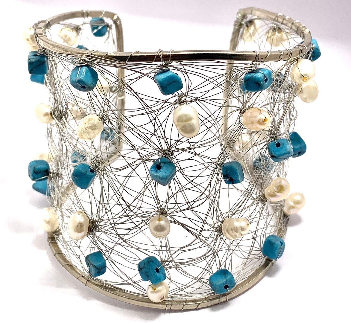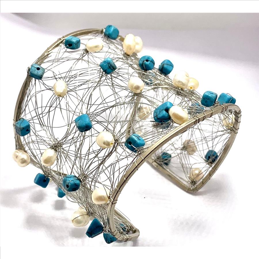 Nina Nguen Design 42 White Pearls & Turquoise Large Bangle Bracelet