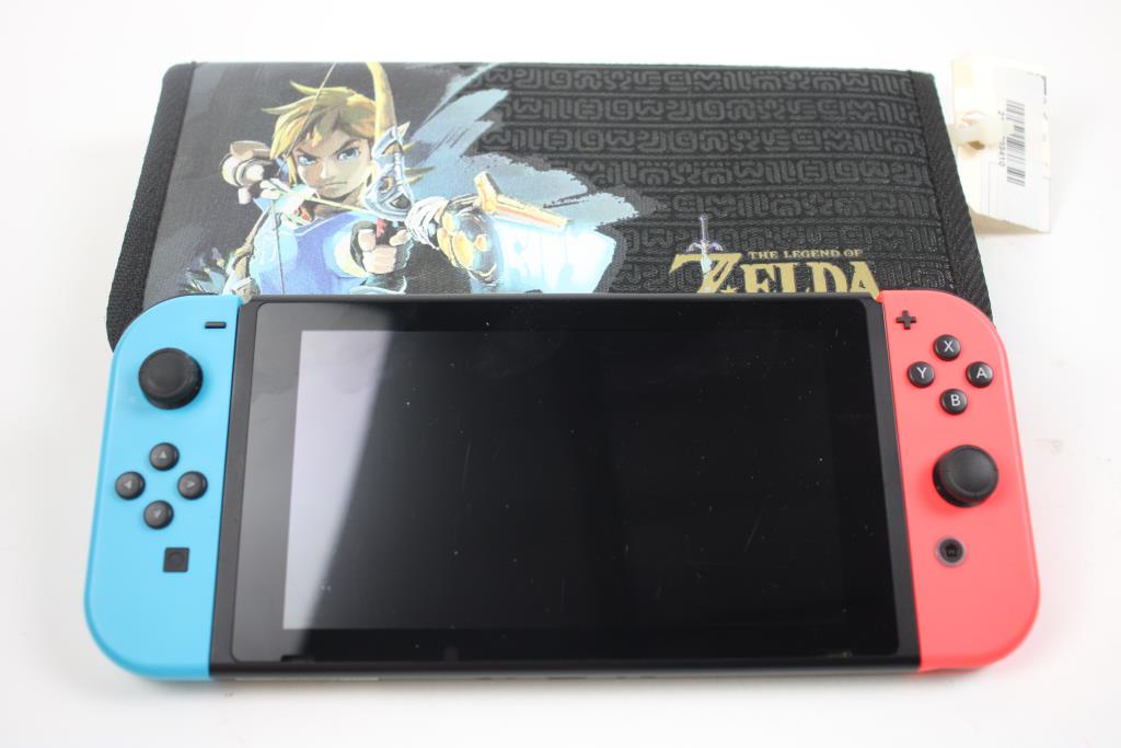 Get a great deal with this online auction presented by PropertyRoom.com on behalf of a law enforcement or public agency client. Model: HAC-001 HDD: 32GB Expandable Memory: MicroSD Controllers: Neon Red and Blue Joy-Cons Included Video Out Cable: None Included Power Cord/Adapter: None Included Accessories: PDP Brand Nintendo Switch The Legend of Zelda: Breath of the Wild Carrying Case Games: None Included Physical Condition: Marks, Scratches, and Scuffs; Screen is Scratched Testing Results: Tested, Powered On, Responded to Touch and Controls; Restored to Factory Settings - No extended runtime testing is performed, item is being "Sold As Is"