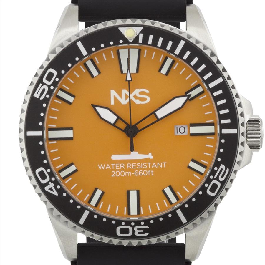 NXS Ocean Warrior Men's Swiss Diver Watch - Black Silicone Strap, Silver Case, Black Bezel, Orange Dial